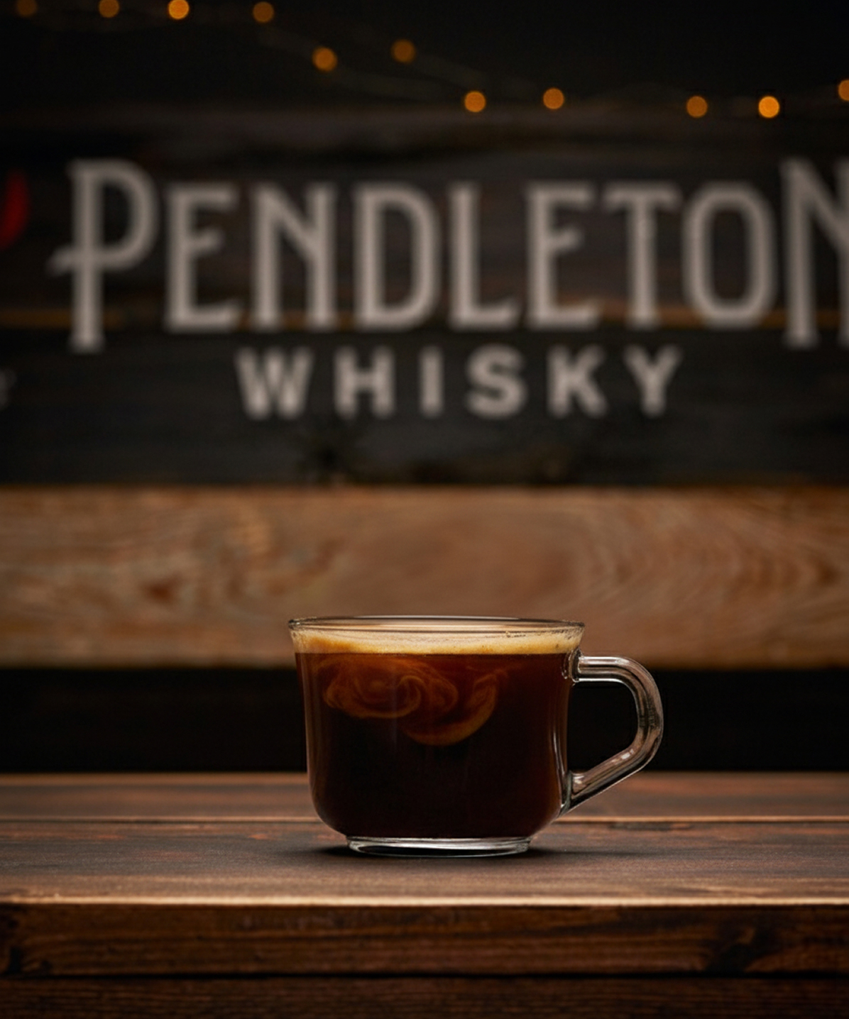 Pour Pendleton® Whisky Original into a glass coffee cup and top with hot coffee. Stir gently.